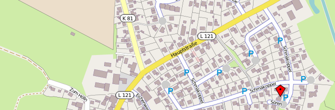 Von der L-121 (Hauptstraße) kommend in die Straße Schmäkoppel des